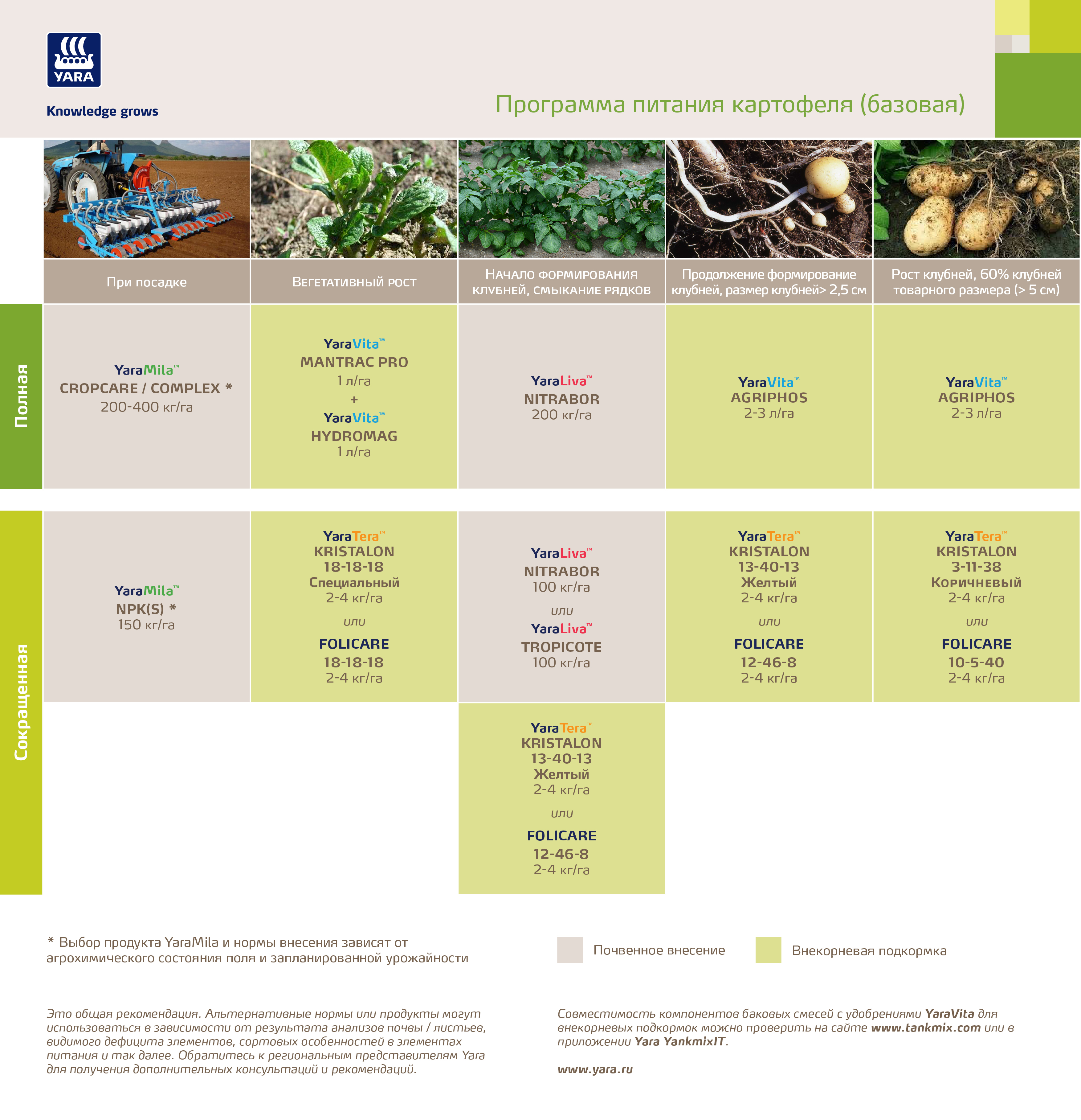 Поглощение элементов питания изменяется в зависимости от стадии роста культуры. Во время раннего весеннего роста возникает большая потребность в макроэлементах и для достижения высокой урожайности очень важна доступность для растения всех питательных веществ. Как калий, так и азот требуются картофеля в период вегетативного роста, завязи клубней и начала клубнеобразование.